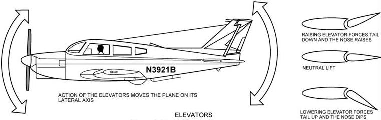 In the previous discussion, the one speed or angle of attack concept was used to explain how longitudinal stability was attained. It is important for the pilot to know that the airplane is stable at various speeds or angles of attack, not just one. The controls, which allow the pilot to depart from the one speed or angle of attack concept or the controls used to give the pilot longitudinal control around the lateral axis, are the elevators and the elevator trim tab. [Figures 1-25 and 1-26]