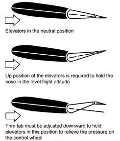 Conversely, if forward pressure is applied to the elevator control, the elevators are lowered, decreasing the horizontal stabilizer’s negative angle of attack and consequently decreasing the downward force on the tail. This decreases the angle of attack of the wings. [Figure 1-25] The elevator trim tab is a small auxiliary control surface hinged at the trailing edge of the elevators. The elevator trim tab acts on the elevators, which in turn acts upon the entire airplane. This trim tab is a part of the elevator but may be moved upward or downward independently of the elevator itself. It is controlled from the cockpit by a control which is separate from the elevator control. The elevator trim tab allows the pilot to adjust the angle of attack for a constant setting and therefore eliminates the need to exert continuous pressure on the elevator control to maintain a constant angle of attack. |