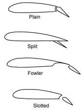 | Figure 2-1 shows the four types of flaps in general use. The plain or simple flap is a portion of the trailing edge of the wing on a hinged pivot which allows the flap to be moved downward, thereby changing the chord line, angle of attack, and the camber of the wing. The split flap is a hinged portion of the bottom surface of the wing only, which when extended increases the angle of attack by changing the chord line. The Fowler flap, when extended, not only tilts downward but also slides rearward on tracks. This increases angle of attack, wing camber, and wing area, thereby providing added lift without significantly increasing drag. The slotted flap in addition to changing the wing’s camber and chord line also lets a portion of high pressure air beneath the wing travel through a slot. This increases the velocity of air and increases lift. |