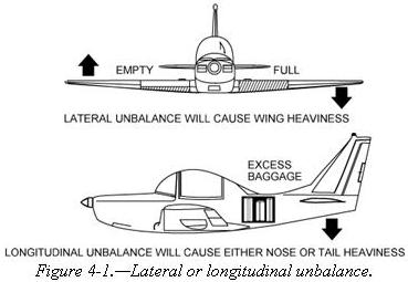 | The position of the lateral CG is not computed, but the pilot must be aware that adverse effects will certainly arise as a result of a laterally unbalanced condition. Lateral unbalance will occur if the fuel load is mismanaged by supplying the engine(s) unevenly from tanks on one side of the airplane. The pilot can compensate for the resulting wing-heavy condition by adjusting the aileron trim tab or by holding a constant aileron control pressure. However, this places the airplane controls in an out-of-streamline condition, increases drag, and results in decreased operating efficiency. Since lateral balance is relatively easy to control and longitudinal balance is more critical, further reference to balance in this handbook will mean longitudinal location of the center of gravity. [Figure 4-1] | ![]() |
