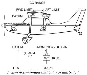 • Station—is a location in the airplane which is identified by a number designating its distance in inches from the datum. The datum is, therefore, identified as station zero. An item located at station +50 would have an arm of 50 inches.