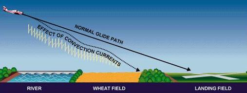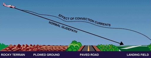 Convection currents also cause difficulty in making landings, since they affect the rate of descent. For example, a pilot flying a normal glide frequently tends to land short of or overshoot the intended landing spot, depending upon the presence and severity of convection currents. [Figures 5-12 and 5-13] |