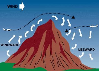 | Figure 5-15.—Airplanes approaching hills or mountains from windward are helped by rising currents. Those approaching from leeward encounter descending currents. |