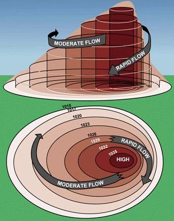 | Figure 5-17.—Above: Flow of air around a “high.” Below: Isobars on a weather map indicate various degrees of pressure within a high. |