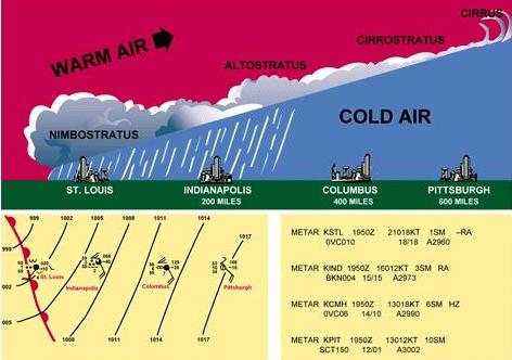 If a return flight to Pittsburgh was made, it would be recommended to wait until the front had passed beyond Pittsburgh, which might require three or four days. Warm fronts generally move at the rate of 10 to 25 MPH. On the trip from Pittsburgh to Indianapolis, a gradual increase in temperature would have been noticed, and a much faster increase in dewpoint until the two coincided. Also the atmospheric pressure would gradually lessen because the warmer air aloft would have less weight than the colder air it was replacing. This condition illustrates the general principle that a falling barometer indicates the approach of stormy weather.