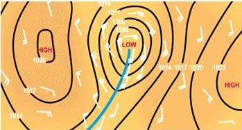 Wind shifts perhaps require further explanation. The wind in a “high” blows in a clockwise spiral. When two highs are adjacent, the winds are in almost direct opposition at the point of contact as illustrated in figure 5-24. Since fronts normally lie between two areas of higher pressure, wind shifts occur in all types of fronts, but they usually are more pronounced in cold fronts.