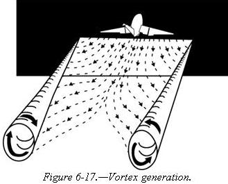 Tests have shown that vortices remain spaced a bit less than a wingspan apart, drifting with the wind, at altitudes greater than a wingspan from the ground. Tests have also shown that the vortices sink at a rate of several hundred feet per minute, slowing their descent and diminishing in strength with time and distance behind the generating aircraft. [Figure 6-18] |