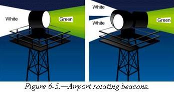 | Airport beacons help a pilot identify an airport at night. The beacons are operated from dusk till dawn and sometimes they are turned on if the ceiling is less than 1,000 feet and/or the ground visibility is less than 3 statute miles (SM) (visual flight rules minimums). However, there is no requirement for this so a pilot has the responsibility of determining if the weather is VFR. The beacon has a vertical light distribution to make it most effective from 1-10° above the horizon, although it can be seen well above or below this spread. The beacon may be an omnidirectional capacitor-discharge device or it may rotate at a constant speed which produces the visual effect of flashes a regular intervals. The combination of light colors from an airport beacon indicates the type of airport. [Figure 6-5] |