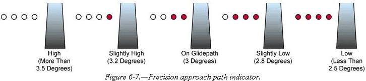 A precision approach path indicator (PAPI) uses lights similar to the VASI system except they are installed in a single row, normally on the left side of the runway. [Figure 6-7]