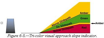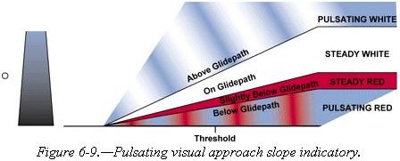 There are also pulsating systems which consist of a single light unit projecting a two-color visual approach path. A below the glidepath indication is shown by the color red, slightly below is indicated by pulsating red, on the glidepath is indicated by a steady white light, and a pulsating white light indicates above the glidepath. [Figure 6-9] |