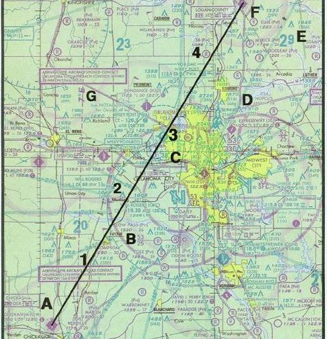 First draw a line from Chickasha Airport (point A) directly to Guthrie Airport (point F). The course line should begin at the center of the airport of departure and end at the center of the destination airport. If the route is direct, the course line will consist of a single straight line. If the route is not direct, it will consist of two or more straight line segments—for example, a VOR station which is off the direct route, but which will make navigating easier, may be chosen (radio navigation is discussed later in this chapter).