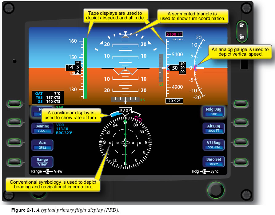 Primary Flight Display (PFD) A PFD presents information about primary flight instruments, navigation instruments, and the status of the flight in one integrated display. Some systems include powerplant information and other systems information in the same display. A typical primary flight display is shown in Figure 2-1.