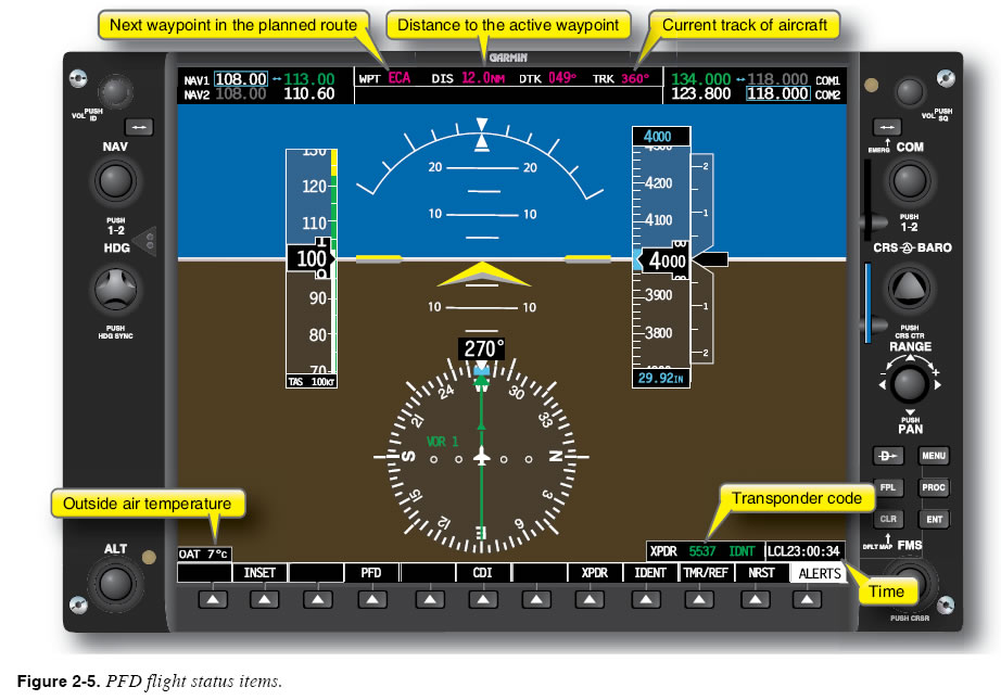 Desired Track The FMS/PFD/MFD navigation display also shows the desired track to the active waypoint. The desired track is the intended course for the active leg in the programmed flight plan. It is the track that connects the waypoint the aircraft just passed to the active waypoint. On the display in Figure 3-17, the current desired track is the 049-degree course between the SUNOL and TRACY waypoints. Track The navigation display shows the aircraft’s track over the ground. The track, which is the result of aircraft heading and winds, tells you which direction the aircraft is actually flying. Winds make it likely that the track and heading will be different. You can get a very good sense of what the winds are doing by comparing the track and heading of the aircraft. If the aircraft is flying a heading of 090 degrees and the track is 080 degrees, the winds are coming from the south. Notice that having a track indication makes it easy to maintain the desired track. To follow the 049-degree desired track to TRACY upon leaving SUNOL, simply fly the heading that results in a track of 049 degrees. The track display eliminates the traditional method of “bracketing” to find a heading that lets you fly the desired track. Groundspeed and ETA The display in Figure 3-17 also shows groundspeed. Again, the navigation display eliminates the need to calculate groundspeed using distance and time. Based on groundspeed and distance from the active waypoint, the navigation page also provides an estimated time of arrival at the active waypoint. Fuel Used and Time Remaining Many advanced avionics navigation units offer fuel calculations and fuel state monitoring. Some units automatically load the initial fuel load, while many require the pilot to correctly enter the amount of fuel into the unit as the beginning fuel on board. Some can have installed transducers (sensors) to measure the fuel used, and display fuel used and time remaining at the current consumption rate. Some lower cost units indicate computed fuel consumption values based on fuel burn rates entered by the pilot. This produces an estimate of fuel used and fuel remaining. This estimate is only as accurate as the values entered by the pilot for fuel on board and the consumption rate. Since the pilot is often using the AFM chart data, there is potential for interpretation error. Then, there is the variation error from the factory charts to the specific aircraft being flown. These factors all tend to degrade the accuracy of the fuel calculation based solely on pilot entered data. Other factors such as a fuel burn that is higher than normal, leaks, or other problems are not displayed unless the system actually registers and senses fuel tank realtime status. These errors can affect both types of systems. The pilot must determine what equipment is installed. Arriving at the Active Waypoint As the aircraft reaches the active waypoint, there are four new tasks for the pilot: (1) recognizing imminent arrival at the active waypoint; (2) leading the turn to avoid overshooting the course to the next waypoint; (3) making the next waypoint the new active waypoint; and (4) selecting the desired course to the new active waypoint. All FMS/RNAV computers offer a sequencing mode that greatly simplifies the performance of the first three of these tasks. Sequencing mode provides three services: waypoint alerting, turn anticipation, and waypoint sequencing. |