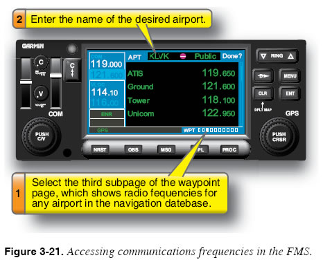 En Route Sensitivity When operating en route, the FMS maintains a sensitivity of 5 nautical miles (NM); that is, a CDI displaying course indications from the FMS deflects full-scale when the aircraft drifts 5 NM to either side of the desired track to the active waypoint. An aircraft is considered to be en route when it is more than 30 NM from the origin and destination airports programmed into the flight plan. There are and have been some units that use different values. Consult your specific unit’s documentation. GPS Signal Status The FMS/RNAV provides position, track, and groundspeed information using signals received from a collection of satellites that are in constant orbit around the Earth when using the GPS navigation source. Although the GPS is highly reliable, satellite reception is sometimes interrupted. Consequently, the pilot must ensure at all times that the system is operational and that it is receiving adequate GPS signals. To simplify this process, all GPS receivers approved for IFR navigation have an automated feature that continually checks the status of the GPS signals. This function is called receiver autonomous integrity monitoring (RAIM). RAIM, which requires adequate simultaneous reception of at least five GPS satellites for IFR navigation reliability, works independently and notifies the pilot when there is a problem with GPS signal reception. When reception problems arise, the FMS/RNAV provides an alert message that notifies the pilot of a GPS reception problem and states that the aircraft position information can no longer be considered reliable. For this reason, regulations require aircraft that are equipped with an RNAV unit using GPS to have an alternate (non-GPS) means of IFR navigation on board (e.g., a VOR receiver) unless the GPS receiver complies with the requirements of WAAS TSO-146B. For all of the previously mentioned reasons, many manufacturers have coupled inertial navigation units with the FMS to deliver unequalled reliability in navigation. Many more complex FMS units also search or scan for distance measuring equipment (DME) signals and VOR signals as additional navigational sources to compute a “blended” position, which is the best calculation from all of the sources and how the FMS is programmed to “consider” the signals for accuracy. GPS RNAV units usually use only GPS signal sources, but may be able to receive VOR and DME signals as well. In the future, many GPS units will probably receive eLORAN as well, since it is a long range navigation system with greatly improved accuracy as compared to the older LORAN-C. One advantage of the LORAN (“e” or “C”) system is that it is ground based and can be easily maintained, as compared to space-based navigation sources. Accessing Navigational Information En Route One of the most useful features of an FMS database is its ability to provide quick access to navigational information. Most units allow the pilot to access information about airports, navigation facilities, airway intersections, and other kinds of waypoints. Figure 3-21 illustrates how one FMS is used to access radio frequencies for an airport.