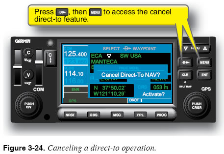 Risk: What Lies Ahead on a Direct-To Route? The direct-to function offers a convenient way to shorten your time and distance en route if ATC authorizes that track. When you perform a direct-to operation, though, remember that the system builds a new track from your present position to the new waypoint. This track does not necessarily correspond to any previously planned airway or route, so it is critical to ensure that your new direct route is clear of all significant obstructions, terrain, weather, and airspace. Cancel Direct To ATC may sometimes cancel a previously issued direct-to clearance and ask you to resume the previously cleared route. Most FMSs offer a simple way of canceling a direct-to operation. Figure 3-24 illustrates the procedure for one FMS.