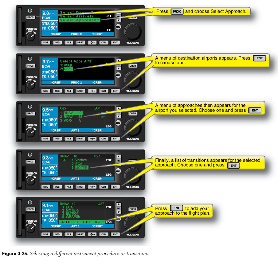 Selecting a Different Instrument Procedure or Transition ATC will sometimes issue an instrument procedure or transition that is different from what you would expect. Entering a new procedure or transition is usually a simple matter of making new menu choices, as illustrated in Figure 3-25. In most units, if you are training or wish to fly the approach again, you must learn how to set the selector or cursor back to the initial fix, which will restart the approach sequence.