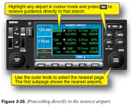 Proceeding Directly to the Nearest Airport One of the most useful features of an FMS is its ability to provide you with immediate access to a large navigation database. This feature is particularly useful when a suitable nearby airport or navigation facility must be located quickly. Figure 3-26 shows how to locate and proceed directly to the nearest suitable airport using one manufacturer’s system.