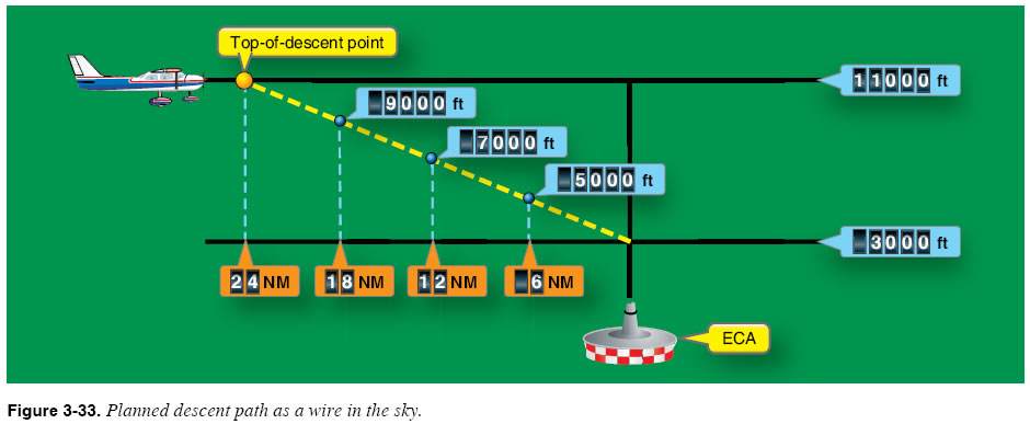 Simple FMS units such as GPS RNAV receivers assume that you will slow the aircraft to the planned descent speed before reaching the top-of-descent point. ATC timing may preclude this plan. Descent Flying Concepts Probably the most important descent flying concept to understand is that a planned descent is basically a “pathway in the sky,” similar to the glideslope associated with an ILS procedure. If you start down at the planned top-of-descent point, fly a groundspeed of 180 knots, and descend at 1,000 feet per minute (fpm), you will be flying on a fixed path between the top-of-descent point and the bottom-of-descent point. If you maintain the 180-knot and 1,000-foot-perminute descent, you will cross a point 18 NM from ECA at exactly 9,000 feet, a point 12 NM from ECA at 7,000 feet, and a point 6 NM from ECA at exactly 5,000 feet, as shown in Figure 3-33.