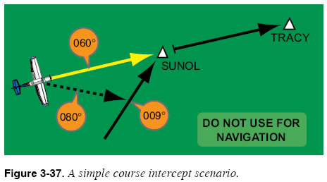 Intercept And Track Course Intercepting and Tracking a Different Course to the Active Waypoint Figure 3-37 illustrates a common situation. Air traffic control instructs you to fly to a waypoint via an inbound course different from the desired track calculated by the FMS. In the example in Figure 3-37, you are en route to SUNOL intersection. The FMS has calculated a desired track of 060 degrees, but ATC has instructed you to fly a heading of 080 degrees to intercept a 009-degree course to SUNOL.