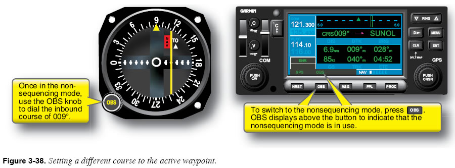 Every FMS/RNAV offers a way to switch to the nonsequencing mode. There is typically a button marked OBS (or Hold), and an OBS or course selection knob to select an inbound course to the active waypoint. Figure 3-38 illustrates the procedure for one particular FMS.
