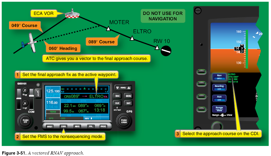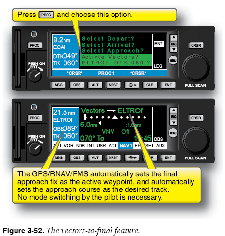 Many FMS/GPS RNAV units offer an automated solution to the problem of flying an approach in which the pilot receives vectors to the final approach course. Once ATC begins providing vectors to intercept the final approach course, you should activate the computer’s “vectors-to-final” feature, which draws a course line along the final approach course. This feature helps you maintain situational awareness while being vectored because the assigned heading is clearly seen in relation to the final approach course. As already noted, you should monitor carefully to ensure that the FMS/GPS RNAV unit switches to approach mode within 2 NM of the final approach fix (FAF). Figure 3-51 shows the vectors-to-final feature. The procedure required to use the vectors-to-final feature is illustrated in Figure 3-52.