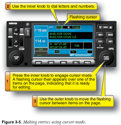 FMS units that do not feature keypads typically require the pilot to make entries using the same knobs to move among chapters and pages. In this case, the knobs have multiple purposes and, thus, have different modes of operation. To use the knobs for data entry, you must first activate what some manufacturers call the “cursor” (or “data entry”) mode. Activating the cursor mode allows you to enter data by turning the knob. In other units, after activating the data entry mode, entries are made by pushing buttons. Figure 3-5 illustrates the use of cursor mode to enter the name of an airport using one FMS. Pressing the inner knob engages cursor mode. A flashing cursor appears over one of the items on the page, indicating that it is ready for editing. Then, the inner knob is used to dial letters and numbers; the outer knob is used to move the flashing cursor between items on the page.