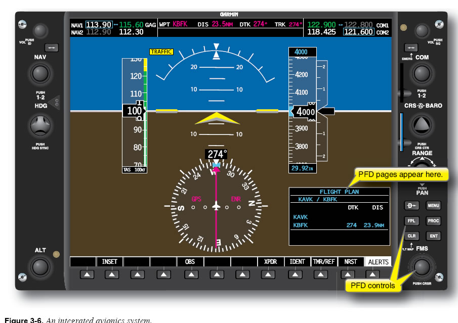 Integrated Avionics Systems Some systems integrate FMS/RNAV display and controls into existing cockpit displays usually called PFDs and MFDs. In this case, there is no separate display to point to and call the RNAV display. Figure 3-6 shows a system that uses the PFD to provide controls and a display for the FMS. This type of system utilizes the same concepts and procedures described above to access and enter into the navigation computer.