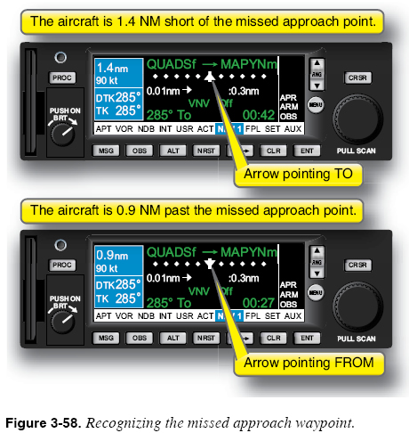 Recognizing the Missed Approach Point With any type of navigation equipment, it is important to be able to determine when you have reached the missed approach point. The missed approach point indications given by FMS/GPS units are sometimes subtle. Consider the two navigation displays shown in Figure 3-58. The display in the top graphic of Figure 3-58 shows the aircraft approaching the missed approach point, 1.4 NM away.