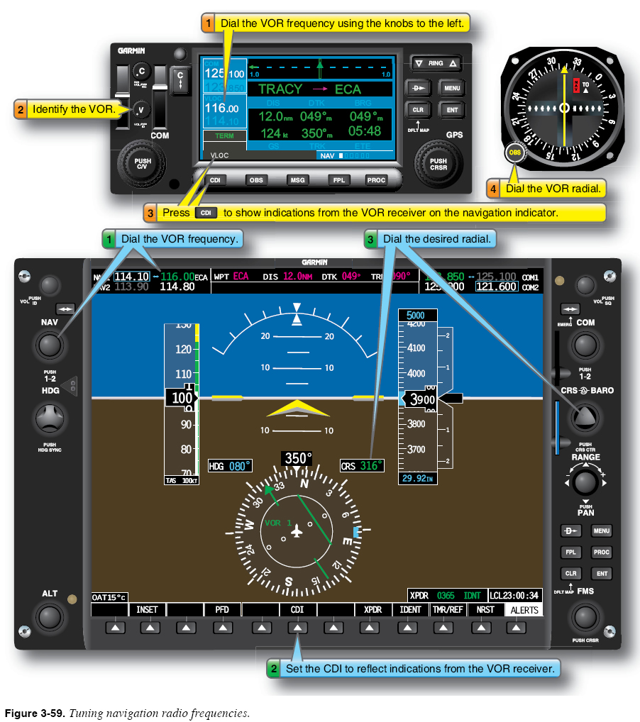 Ground-Based Radio Navigation Configuring FMS To Receive Ground-Based Radio Navigation Signals Most advanced avionics systems include receivers for conventional radio navigation signals from VOR, localizer, and glideslope transmitters. To display these signals on the navigation display indicator(s), you need two fundamental skills. Tuning and Identifying Radio Navigation Facilities The first fundamental skill in ground-based radio navigation is tuning and identifying a ground-based radio navigation facility. Figure 3-59 illustrates how a VOR station can be tuned using two different systems. Some systems automatically attempt to identify ground-based radio navigation facilities that are selected by the pilot. Note the identifier that appears beside the selected frequency in the upper left corner of the PFD in Figure 3-59 (116.00 = ECA).