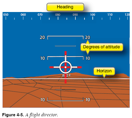 Determination of Control Movements Required To Achieve Goals Suppose you wish to use the autopilot/FD to turn to an assigned heading of 270°. The heading knob is used to select the new heading. Before any control movements are made, the autopilot/FD must first determine which control movements are necessary (e.g., left or right turn). To do so, the FD/autopilot must first determine the aircraft’s current heading and bank angle, determine amount and direction of the turn, and then choose an appropriate bank angle, usually up to 30° or less. To make these determinations, the FD gathers and processes information from the aircraft’s ADC (airspeed and altitude), magnetic heading reference instrument, and navigation systems. Carrying Out Control Movements Once the FD/autopilot has determined which control movements are necessary to achieve the flight change, the autopilot has the task of carrying out those control movements. Every autopilot system features a collection of electromechanical devices, called servos, that actuate the aircraft control surfaces. These servos translate electrical commands into motion, the “muscle” that actually moves the control surfaces. Flight Director Flight Director Functions An FD is an extremely useful aid that displays cues to guide pilot or autopilot control inputs along a selected and computed flightpath. [Figure 4-5] The flight director usually receives input from an ADC and a flight data computer. The ADC supplies altitude, airspeed and temperature data, heading data from magnetic sources such as flux valves, heading selected on the HSI (or PFD/multi-function display (MFD)/ electronic horizontal situation indicator (EHSI)), navigation data from FMS, very high frequency omnidirectional range (VOR)/distance measuring equipment (DME), and RNAV sources. The flight data computer integrates all of the data such as speed, position, closure, drift, track, desired course, and altitude into a command signal.
