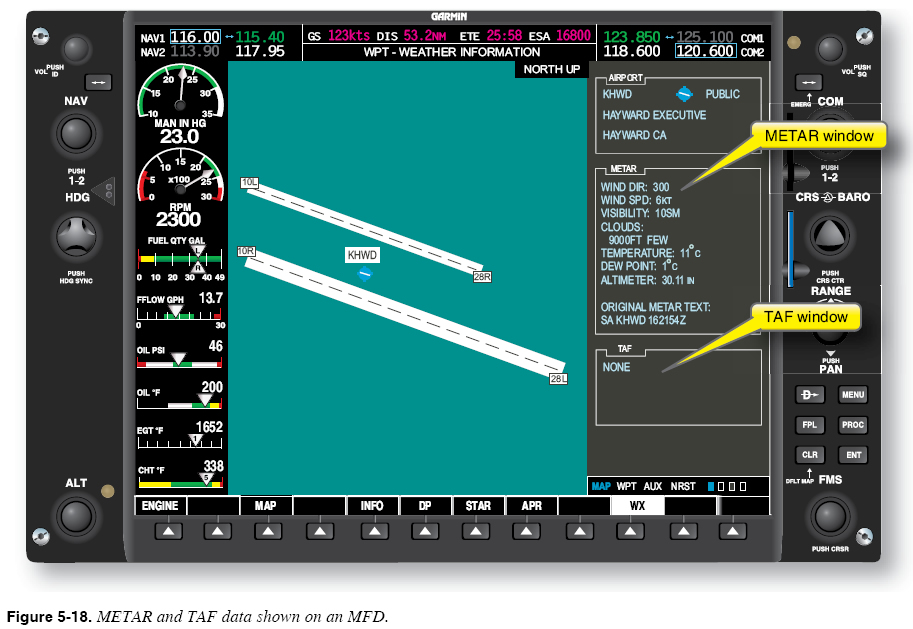 Other Weather Products Broadcast weather services offer many of the other weather products that can be obtained during a pre-flight briefing on the ground. Broadcast weather services can also provide graphical wind data, SIGMETs and AIRMETs, freezing levels, temporary flight restrictions, surface analyses, and hurricane tracks. The MFD in Figure 5-18 shows METAR and TAF data.
