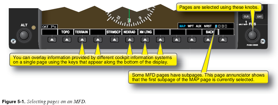 Multi-Function Display A multi-function display (MFD) presents information drawn from a variety of aircraft information systems. Many installations allow overlay or inclusion of systems indications in the primary flight display (PFD), in addition to the primary flight instrument indications. By allowing you to view information provided by any one or combination of the installed systems, the MFD prevents the need for a separate display for each system. As does the flight management system (FMS)/area navigation (RNAV) unit, the MFD allows you to select different pages from different chapters that display information provided by various aircraft systems. Other controls allow you to combine information from multiple systems on one page. In many installations, the MFD serves as the backup or faildown display for the PFD. You should have a working knowledge of the faildown selection procedures and how to select the necessary data displays for the current flight phase. The controls provided by one MFD are shown in Figure 5-1.