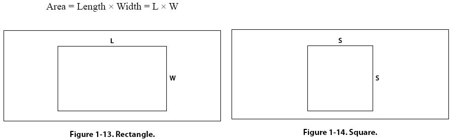 Use the acronym PEMDAS to remember the order of operation in algebra. PEMDAS is an acronym for parentheses, exponents, multiplication, division, addition, and subtraction. To remember it, many use the sentence, “Please Excuse My Dear Aunt Sally." Always remember, however, to multiply/divide or add/subtract in one sweep from left to right, not separately. Computing Area of Two-dimensional Solids Area is a measurement of the amount of surface of an object. Area is usually expressed in such units as square inches or square centimeters for small surfaces or in square feet or square meters for larger surfaces. Rectangle A rectangle is a four-sided figure with opposite sides of equal length and parallel. [Figure 1-13] All of the angles are right angles. A right angle is a 90° angle. The rectangle is a very familiar shape in mechanics. The formula for the area of a rectangle is: Area = Length x Width = L x W Example: An aircraft floor panel is in the form of a rectangle having a length of 24 inches and a width of 12 inches. What is the area of the panel expressed in square inches? First, determine the known values and substitute them in the formula. A = L x W = 24 inches x 12 inches = 288 square inches Square A square is a four-sided figure with all sides of equal length and parallel. [Figure 1-14] All angles are right angles. The formula for the area of a square is: Area = Length x Width = L x W