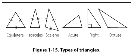 Triangle A triangle is a three-sided figure. The sum of the three angles in a triangle is always equal to 180°. Triangles are often classified by their sides. An equilateral triangle has 3 sides of equal length. An isosceles triangle has 2 sides of equal length. A scalene triangle has three sides of differing length. Triangles can also be classified by their angles: An acute triangle has all three angles less than 90°. A right triangle has one right angle (a 90° angle). An obtuse triangle has one angle greater than 90°. Each of these types of triangles is shown in Figure 1-15.