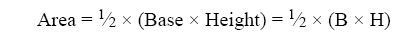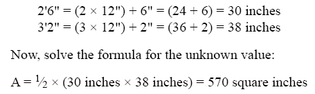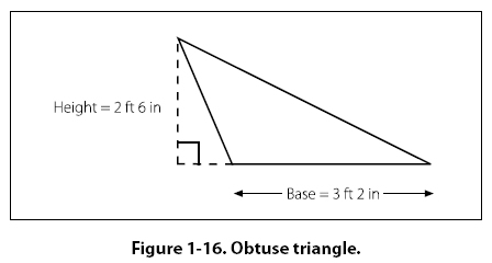 Example: Find the area of the obtuse triangle shown in Figure 1-16. First, substitute the known values in the area formula. A = 1⁄2 x (B x H) = 1⁄2 x (2'6" x 3'2")