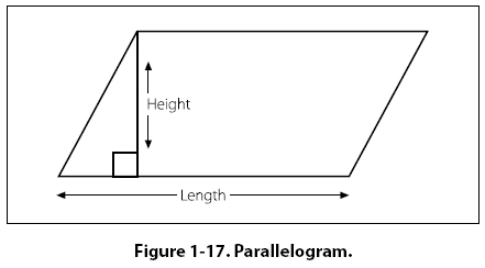 Parallelogram A parallelogram is a four-sided figure with two pairs of parallel sides. [Figure 1-17] Parallelograms do not necessarily have four right angles. The formula for the area of a parallelogram is: Area = Length x Height = L x H
