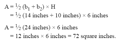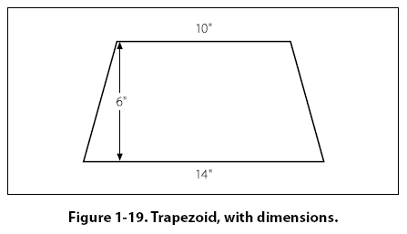 Example: What is the area of a trapezoid in Figure 1-19 whose bases are 14 inches and 10 inches, and whose height (or altitude) is 6 inches? First, substitute the known values in the formula.