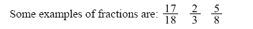 The solution is 31 bolts per aircraft with a remainder of 1 bolt left over. Fractions A fraction is a number written in the form N/D where N is called the numerator and D is called the denominator. The fraction bar between the numerator and denominator shows that division is taking place.