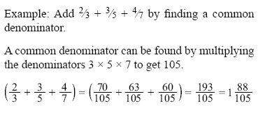 The denominator of a fraction cannot be a zero. For example, the fraction 2/0 is not allowed. An improper fraction is a fraction in which the numerator is equal to or larger than the denominator. For example, 4/4 or 15/8 are examples of improper fractions. Finding the Least Common Denominator To add or subtract fractions, they must have a common denominator. In math, the least common denominator (LCD) is commonly used. One way to find the LCD is to list the multiples of each denominator and then choose the smallest one that they have in common. Example: Add 1⁄5 + 1⁄10 by finding the least common denominator. Multiples of 5 are: 5, 10, 15, 20, 25, and on. Multiples of 10 are: 10, 20, 30, 40, and on. Notice that 10, 20, and 30 are in both lists, but 10 is the smallest or least common denominator (LCD). The advantage of finding the LCD is that the final answer is more likely to be in lowest terms. A common denominator can also be found for any group of fractions by multiplying all of the denominators together. This number will not always be the LCD, but it can still be used to add or subtract fractions.