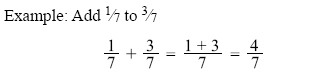 If the fractions do not have the same denominator, then one or all of the denominators must be changed so that every fraction has a common denominator. Example: Find the total thickness of a panel made from 3/32-inch thick aluminum, which has a paint coating that is 1/64-inch thick. To add these fractions, determine a common denominator. The least common denominator for this example is 1, so only the first fraction must be changed since the denominator of the second fraction is already 64.