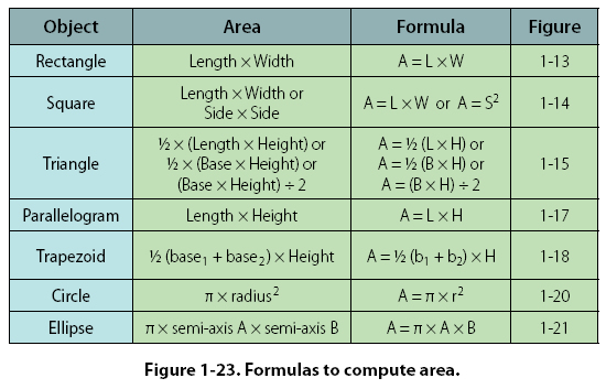 Units of Area A square foot measures 1 foot by 1 foot. It also measures 12 inches by 12 inches. Therefore, one square foot also equals 144 square inches (that is, 12 x 12 = 144). To convert square feet to square inches, multiply by 144. To convert square inches to square feet, divide by 144. A square yard measures 1 yard by 1 yard. It also measures 3 feet by 3 feet. Therefore, one square yard also equals 9 square feet (that is, 3 x 3 = 9). To convert square yards to square feet, multiply by 9. To convert square feet to square yards, divide by 9. Refer to Figure 1-37, Applied Mathematics Formula Sheet, at the end of the chapter for a comparison of different units of area. Figure 1-23 summarizes the formulas for computing the area of two-dimensional solids.