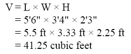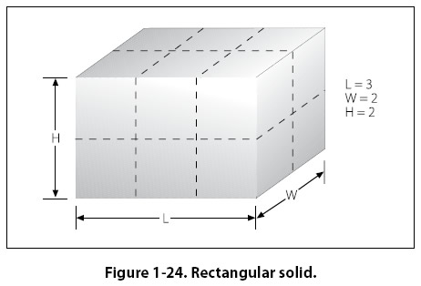 In Figure 1-24, the rectangular solid is 3 feet by 2 feet by 2 feet. The volume of the solid in Figure 1-24 is = 3 ft x 2 ft x 2 ft = 12 cubic feet. Example: A rectangular baggage compartment measures 5 feet 6 inches in length, 3 feet 4 inches in width, and 2 feet 3 inches in height. How many cubic feet of baggage will it hold? First, substitute the known values into the formula.