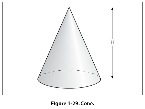 Cone A solid with a circle as a base and with sides that gradually taper to a point is called a cone. [Figure 1-29] The formula for the volume of a cone is given as: