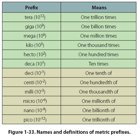 Example: The cargo door opening in a military airplane is a rectangle that is 5 1/2 feet tall by 7 feet wide. A section of square steel plate that is 8 feet wide by 8 feet tall by 1 inch thick must fit inside the airplane. Can the square section of steel plate fit through the cargo door? It is obvious that the square steel plate will not fit horizontally through the cargo door. The steel plate is 8 feet wide and the cargo door is only 7 feet wide. However, if the steel plate is tilted diagonally, will it fit through the cargo door opening? The diagonal distance across the cargo door opening can be calculated using the Pythagorean Theorem where “a" is the cargo door height, “b" is the cargo door width, and “c" is the diagonal distance across the cargo door opening. The diagonal distance across the cargo door opening is 8.9 feet, so the 8-foot wide square steel plate will fit diagonally through the cargo door opening and into the airplane. Measurement Systems Conventional (U.S. or English) System Our conventional (U.S. or English) system of measurement is part of our cultural heritage from the days when the thirteen colonies were under British rule. It started as a collection of Anglo-Saxon, Roman, and Norman-French weights and measures. For example, the inch represents the width of the thumb and the foot is from the length of the human foot. Tradition holds that King Henry I decreed that the yard should be the distance from the tip of his nose to the end of his thumb. Since medieval times, commissions appointed by various English monarchs have reduced the chaos of measurement by setting specific standards for some of the most important units. Some of the conventional units of measure are: inches, feet, yards, miles, ounces, pints, gallons, and pounds. Because the conventional system was not set up systematically, it contains a random collection of conversions. For example, 1 mile = 5,280 feet and 1 foot = 12 inches. Metric System The metric system, also known as the International System of Units (SI), is the dominant language of measurement used today. Its standardization and decimal features make it well-suited for engineering Figure 1-32. Pythagorean Theorem. and aviation work. The metric system was first envisioned by Gabriel Mouton, Vicar of St. Paul’s Church in Lyons, France. The meter is the unit of length in the metric system, and it is equal to one ten-millionth of the distance from the equator to the North Pole. The liter is the unit of volume and is equal to one cubic decimeter. The gram is the unit of mass and is equal to one cubic centimeter of water. All of the metric units follow a consistent naming scheme, which consists of attaching a prefix to the unit. For example, since kilo stands for 1,000 one kilometer equals 1,000 meters. Centi is the prefix for one hundredth, so one meter equals one hundred centimeters. Milli is the prefix for one thousandths and one gram equals one thousand milligrams. Refer to Figure 1-33 for the names and definitions of metric prefixes.