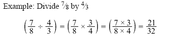 Division of Fractions Division of fractions does not require a common denominator. To divide fractions, first change the division symbol to multiplication. Next, invert the second fraction. Then, multiply the fractions.