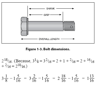 Subtraction of Mixed Numbers To subtract mixed numbers, find a common denominator for the fractions. Subtract the fractions from each other (it may be necessary to borrow from the larger whole number when subtracting the fractions). Subtract the whole numbers from each other. The final step is to combine the final whole number with the final fraction. Example: What is the length of the grip of the bolt shown in Figure 1-3? The overall length of the bolt is 31/2 inches, the shank length is 31/8 inches, and the threaded portion is 15/16 inches long. To find the grip, subtract the length of the threaded portion from the length of the shank.