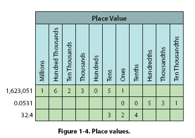 Therefore, the grip length of the bolt is 113/16 inches. (Note: The value for the overall length of the bolt was given in the example, but it was not needed to solve the problem. This type of information is sometimes referred to as a “distracter" because it distracts from the information needed to solve the problem.) The Decimal Number System The Origin and Definition The number system that we use every day is called the decimal system. The prefix in the word decimal is a Latin root for the word “ten." The decimal system probably had its origin in the fact that we have ten fingers (or digits). The decimal system has ten digits: 0, 1, 2, 3, 4, 5, 6, 7, 8, and 9. It is a base 10 system and has been in use for over 5,000 years. A decimal is a number with a decimal point. For example, 0.515, .10, and 462.625 are all decimal numbers. Like whole numbers, decimal numbers also have place value. The place values are based on powers of 10, as shown in Figure 1-4.