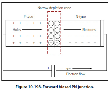 Forward Biased Diode Figure 10-198 illustrates a forward biased PN junction. When an external voltage is applied to a PN junction, it as called bias. In a forward biased PN junction or diode, the negative voltage source is connected to the N-type material and the positive voltage source is connected to the P-type material. In this configuration, the current can easily flow. If a battery is used to bias the PN junction and it is connected in such a way that the applied voltage opposes the junction field, it will have the effect of reducing the junction barrier and consequently aid in the current flow through the junction.