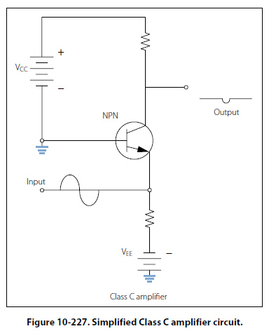 Class C Figure 10-227, shows a simplified Class C amplifier circuit. In Class C operations, transistor current flows for less than 50 percent of the input signal. This class of operation is the most efficient. Because the transistor does not conduct except during a small portion of the input signal, this is the most efficient class of amplifier. The distortion of the Class C amplifier is greater (poor fidelity) than the Class A, AB, and B amplifiers because a small portion of the input signal is reproduced on the output. Class C amplifiers are used when the output signal is used for only small portions of time.