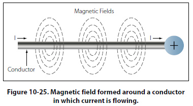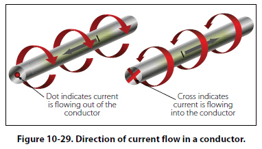 Although it has been stated that the lines of force have direction, this should not be construed to mean that the lines have motion in a circular direction around the conductor. Although the lines of force tend to act in a clockwise or counterclockwise direction, they are not revolving around the conductor. Since current flows from negative to positive, many illustrations indicate current direction with a dot symbol on the end of the conductor when the electrons are flowing toward and a plus sign when the current is flowing away from the observer. [Figure 10-29]